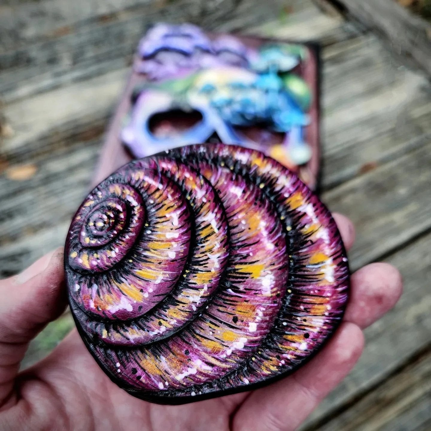 Crafted with exquisite attention to detail, this key box features a stunning design of a skull surrounded by intricate natural elements, such as mushrooms and leaves, which adds a touch of mystique and allure to its appearance. The snail nestled beside the skull is not just a mere ornament, it serves as the key to unlock the hidden compartments concealed within.This element of mystery and puzzle-like interaction enhances the allure of the key box, making it a fascinating conversation starter and an ideal gift for those who appreciate both art and functionality.